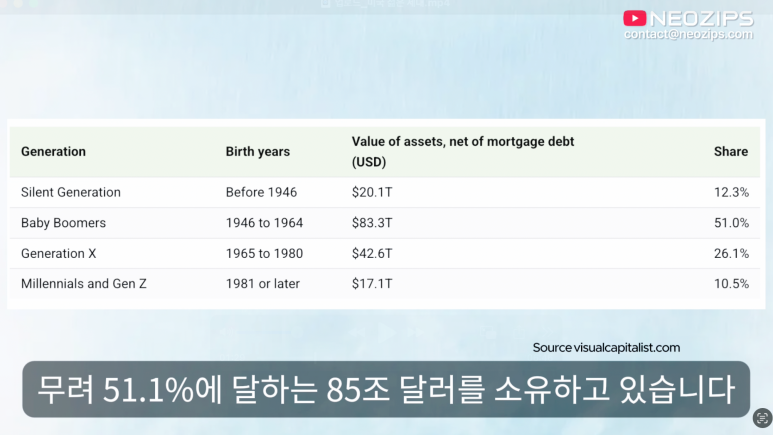 현재 베이비부머 세대는 미국 전체 가계 순자산 167조 달러 중 무려 51.1%에 달하는 85조 달러를 소유하고 있습니다. 반면, 경제 활동의 주축인 밀레니얼과 Z세대의 자산을 모두 합쳐도 전체의 약 10% 수준에 불과합니다. 이 압도적인 격차는 근면성의 차이가 아니라 바로 ‘타이밍의 차이’에서 발생했습니다.